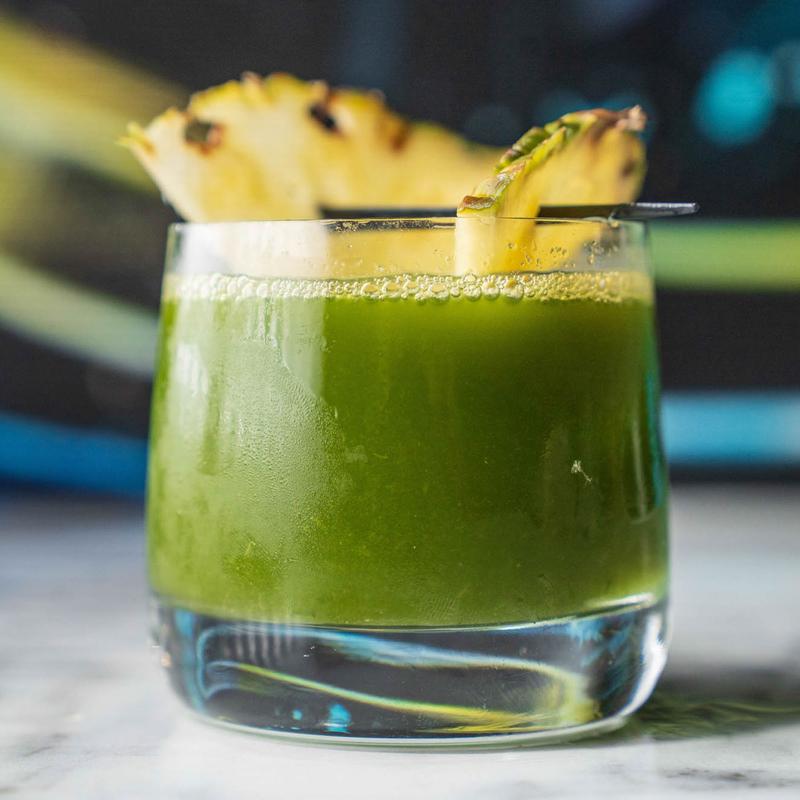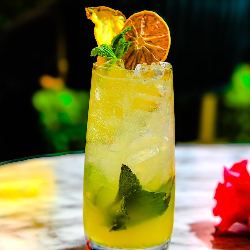 Malibu Coconut rum, pineapple liqueur, mint syrup, pineapple juice, nectar, club soda, fresh mint, and limes.